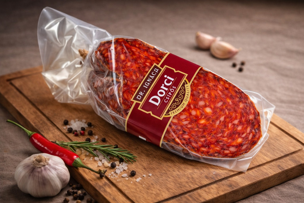 Hagyományos, csabai recept alapján készült, adalékmentes csípős kolbászhúsból készült dorka, amely nagy keresztmetszetű, hosszú érlelésű és rendkívül ízletes.